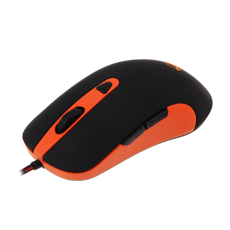 A classic gaming mouse with a black and orange color scheme, designed for gaming. Streamlined design enhances grip. 4000dpi high-resolution optical sensor, the resolution can be changed by driver software. Backlight and additional keys allow you to enjoy the convenience of control in any game. Gaming sensors work on any surface. The DPI change button lets you adjust the speed of mouse movement, and a color indicator reminds you which settings are currently in use. The button design on the left can help you fast forward or backward, improving efficiency.